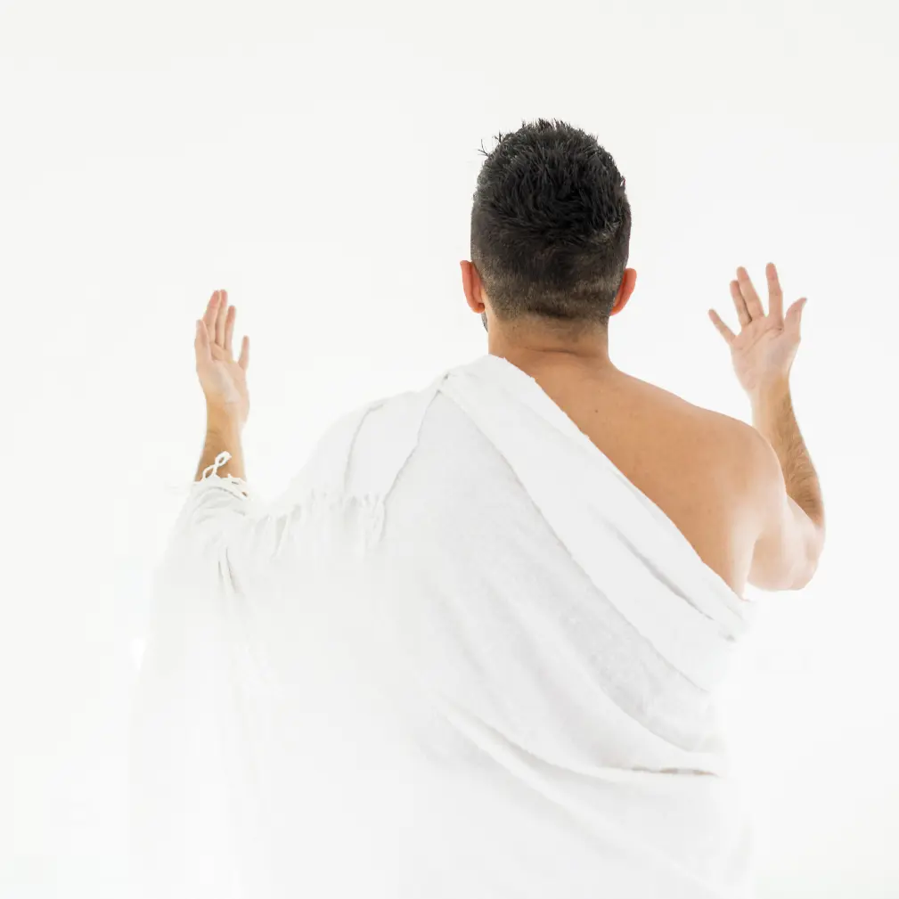 Wear the prescribed clothing and make the intention (Niyyah) for Umrah, then recite the Talbiyah as you begin your sacred state.