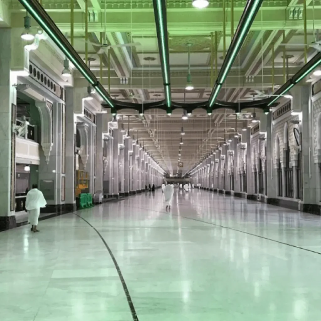 After completing Tawaf, follow the guidance signs inside the Grand Mosque that direct you to Al-Safa, the starting point of the Sa’i journey.